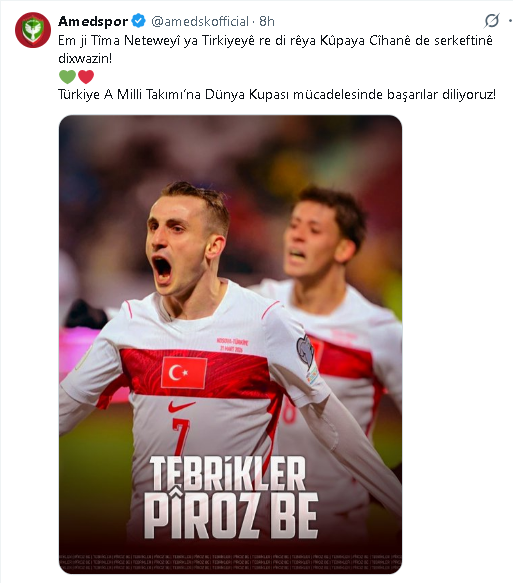 Amedspor Kulübü, resmi hesabından iki dilde mesaj yayınladı. Yeşil-kırmızılılar, “Em ji Tîma Neteweyî ya Tirkiyeyê re di rêya Kûpaya Cîhanê de serkeftinê dixwazin! Türkiye A Milli Takımı’na Dünya Kupası mücadelesinde başarılar diliyoruz!” mesajını yayınladı. Ayrıca mesajda yer alan fotoğrafta da ‘Piroz be, tebrikler’ ifadeleri yer aldı.