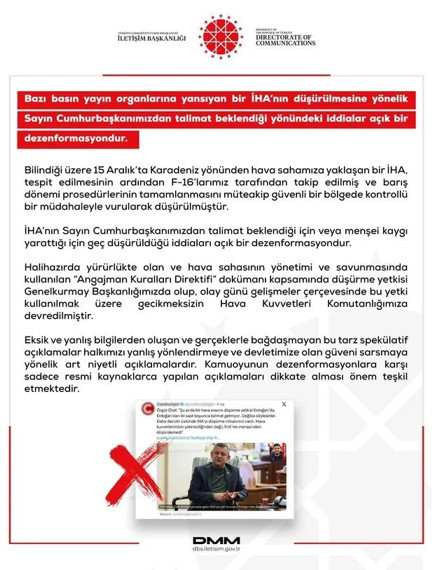 İletişim Başkanlığı Dezenformasyonla Mücadele Merkezi’nden (DMM) yapılan açıklamada ise “Bazı basın yayın organlarına yansıyan bir İHA’nın düşürülmesine yönelik Sayın Cumhurbaşkanımızdan talimat beklendiği yönündeki iddialar açık bir dezenformasyondur.” ifadelerine yer verildi.