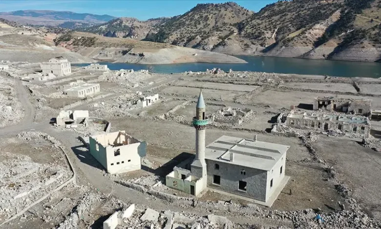Kars’ın Sarıkamış ilçesindeki Karakurt HES Barajı’nda su seviyesinin düşmesiyle daha önce sular altında kalan köy evleri ve tarihi binalar tekrar gün yüzüne çıktı.