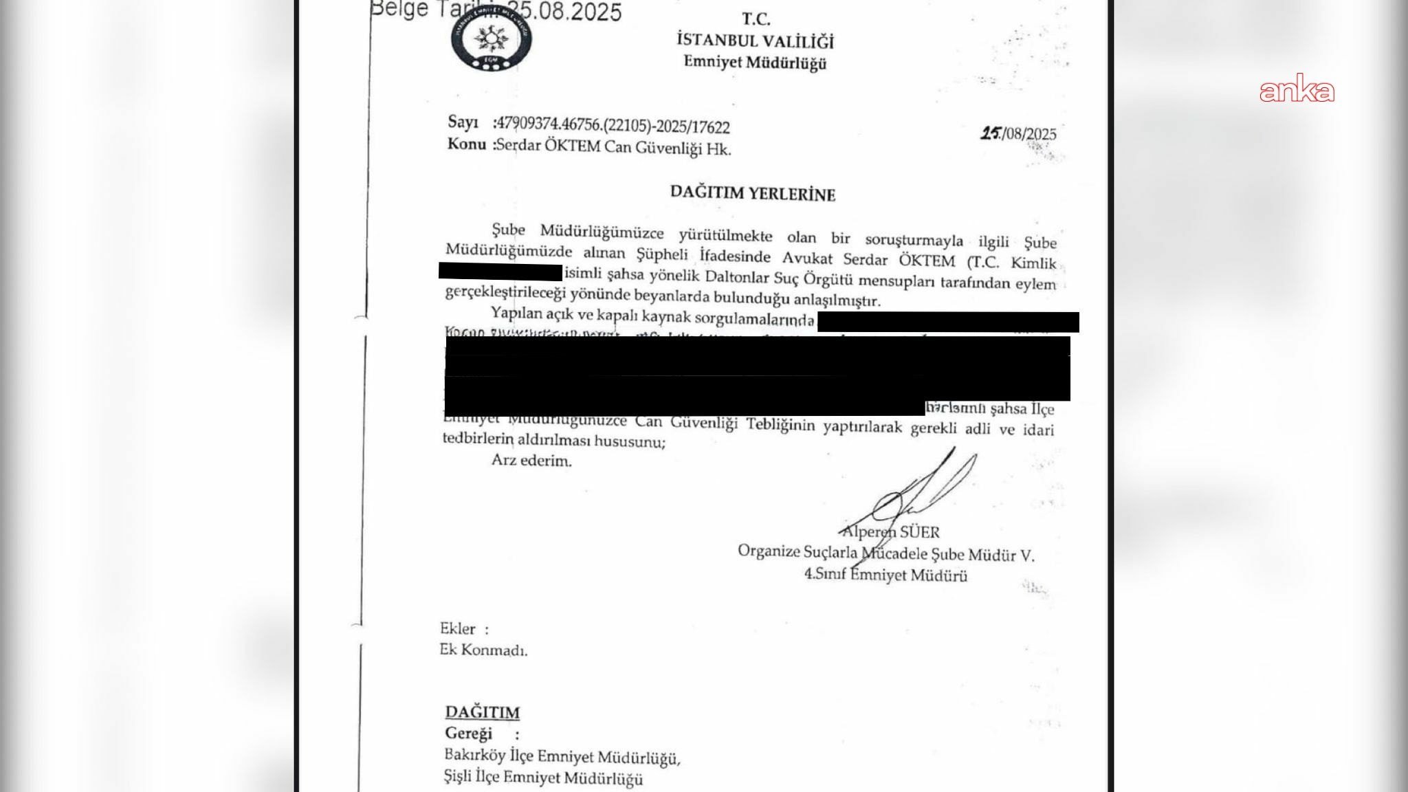 “Şube Müdürlüğümüzce yürütülmekte olan bir soruşturmayla ilgili Şube Müdürlüğümüzde alınan Şüpheli İfadesinde Avukat Serdar ÖKTEM isimli şahsa yönelik Daltonlar Suç Örgütü mensupları tarafından eylem gerçekleştirileceği yönünde beyanlarda bulunduğu anlaşılmıştır. Yapılan açık ve kapalı kaynak sorgulamalarında Ataköy’de evi ve Şişli’de ofisi bulunduğu anlaşılmış olup Serdar ÖKTEM isimli şahsa İlçe Emniyet Müdürlüğünüzce Can Güvenliği Tebliğinin yaptırılarak gerekli adli ve idari tedbirlerin aldırılması hususunu arz ederim.”